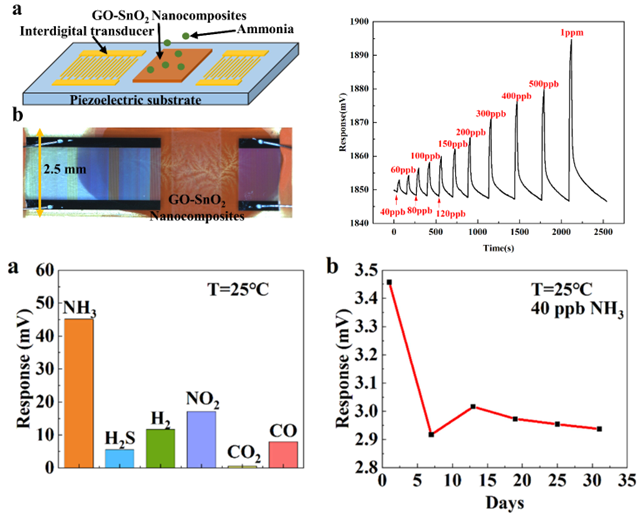 中科院聲學所超聲學實驗室王文研究團隊與中科院空天技術研究院孫建海團隊合作,將微納聲表面波器件技術與氧化石墨烯-氧化錫(GO-SnO2)納米復合材料相結合,設計并制作了一種在室溫條件下(25攝氏度)靈敏度達到ppb級的新型聲表面波氨氣傳感器。該復合材料具有較大的表面積和較多的化學活性位點,大幅增加了氨氣吸附效率,從而提高了傳感器靈敏度與響應速度。