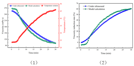 超聲作用引起重油黏度變化機理的相關研究對于超聲波技術在重油的勘探、開發及運輸等方面的應用具有重要的意義。研究人員大多基于超聲作用前后重油的黏度測量開展實驗,很少有學者對超聲作用過程中重油黏度的實時變化進行表征,而借助相關分析方法揭示黏度實時變化機理的研究則更少。