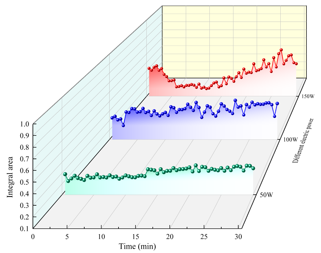 圖3 不同電功率條件下隨著超聲作用時間的增加寬頻帶噪聲譜積分面積的變化(圖/中國科學院聲學研究所)