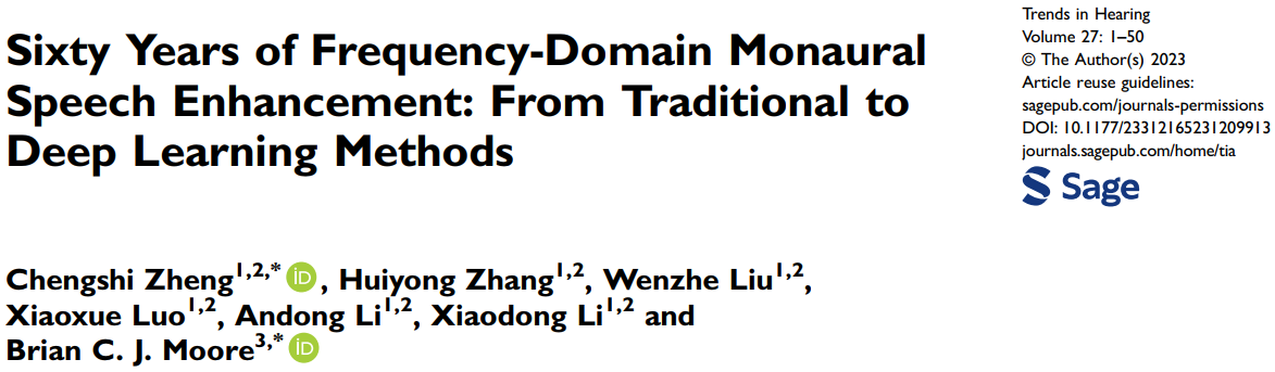 Zheng, C., Zhang, H., Liu, W., Luo, X., Li, A., Li, X., & Moore, B. C. (2023). Sixty years of frequency-domain monaural speech enhancement: From traditional to deep learning methods.?Trends in Hearing,?27, 23312165231209913.?DOI:?10.1177/23312165231209913
