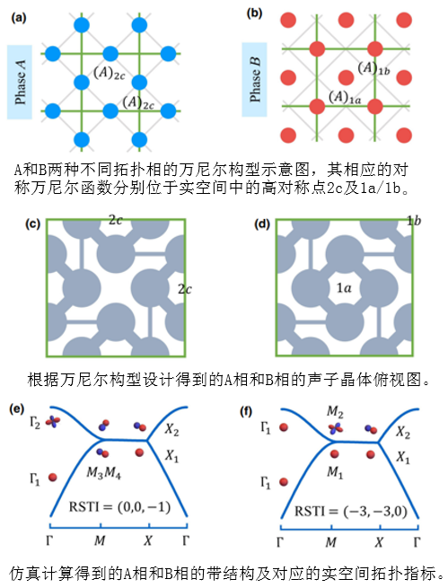 拓撲聲子晶體的設計往往基于在倒空間中分析高對稱點的聲場模式,其設計依賴研究人員的經驗,缺少統一的方案。為解決這一問題,中國科學院聲學研究所噪聲與振動重點實驗室的博士研究生張鵬與導師楊軍研究員、賈晗研究員從實空間拓撲表示理論出發,與武漢大學劉正猷教授、華南理工大學陸久陽副教授合作,首次在聲學體系中基于萬尼爾函數分布構造了支持多維度拓撲界面態的聲子晶體。相關研究成果于在線發表于國際學術期刊Physical Review Applied(IF = 4.931)。