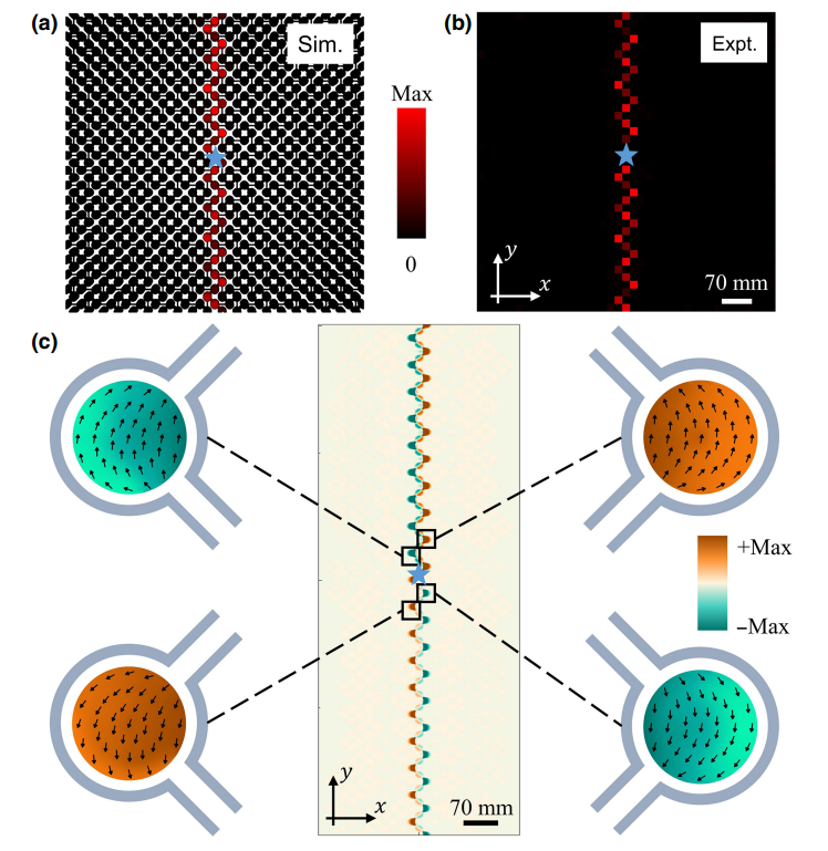 圖3 拓撲界面態的聲學表征。(a) 仿真計算及(b) 實驗測量得到的拓撲界面態的聲壓場分布(1.4 kHz)。(c)仿真計算(中圖)與實驗測量(放大圖)得到的聲贗自旋場分布。(圖/中國科學院聲學研究所)