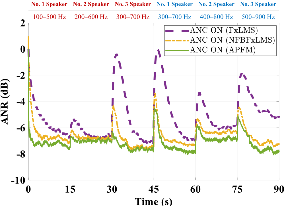近期,中國科學(xué)院聲學(xué)研究所噪聲與音頻聲學(xué)實(shí)驗室的博士研究生殷蘭和張澤強(qiáng)與其導(dǎo)師楊軍研究員、吳鳴研究員等人提出了一種能夠快速響應(yīng)和抑制變化的車內(nèi)路面噪聲的自適應(yīng)并行濾波方法( Adaptive Parallel Filtering Method, APFM ),并將其應(yīng)用于多通道前饋ANC頭枕系統(tǒng)中。APFM分為兩個階段:調(diào)諧階段和控制階段。在調(diào)諧階段,科研人員用一系列潛在的初級噪聲來訓(xùn)練相應(yīng)的最優(yōu)固定控制濾波器;在控制階段,選擇最合適的并行控制濾波器并以最小化估計誤差信號在一幀內(nèi)的能量。隨后他們提出了一種無延遲的可變步長歸一化頻域塊的濾波x最小均方差 ( Variable Step Size-Normalized Frequency-domain Block Filtered-X Least Mean Square, VSS-NFBFxLMS )算法以幀速率更新所選控制濾波器。通過這種方式,APFM實(shí)現(xiàn)了快速降噪響應(yīng)和低穩(wěn)態(tài)誤差。作為抑制變化噪聲的魯棒方法,APFM在衰減非預(yù)訓(xùn)練干擾下取得了優(yōu)越的性能。