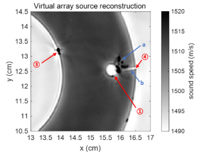 軟組織體模的聲速參數重建結果如圖2所示,體模內外邊緣清晰,尺寸和真實尺寸一致。一些已知特征也被成功重建,此外三點鐘方向內部孔洞周圍的一些破裂和小塊脫落也在成像結果中清晰可見。該研究基于實驗數據對軟組織體模進行定量成像,分辨率可達亞毫米級。