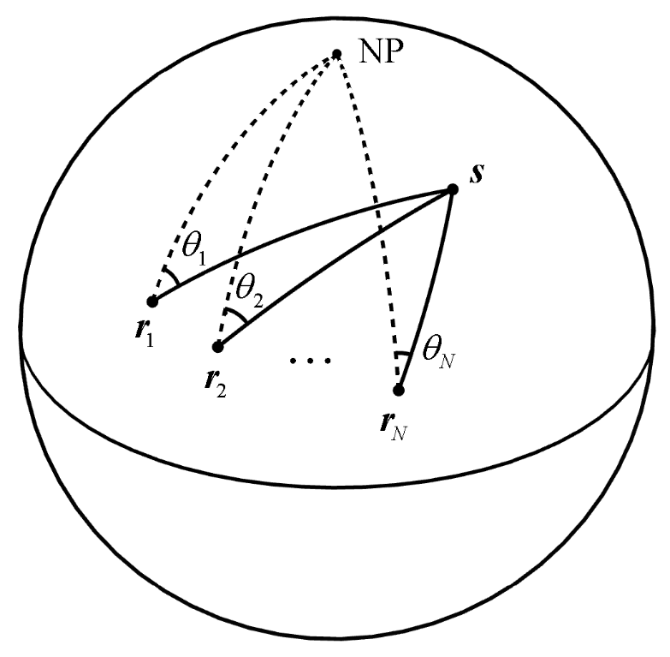 聲源的波達(dá)角度(Angle Of Arrivals, AOA) 定位問(wèn)題實(shí)際是球面AOA的定位問(wèn)題。球面AOA定位問(wèn)題的傳統(tǒng)解決方法主要包括球面三角定位法 (Spherical Triangulation, ST) 和最大似然估計(jì)器 (Maximum Likelihood Estimator, MLE)。ST算法通過(guò)計(jì)算球面示向線的交點(diǎn)來(lái)估計(jì)兩個(gè)臺(tái)站情況下的信源位置,是一種簡(jiǎn)單直觀的方法,但是對(duì)于多臺(tái)站的情況定位性能較差。MLE算法是最常用的球面AOA定位方法,受限于其迭代求解的特性,算法往往具有較高的計(jì)算復(fù)雜度。同時(shí)MLE算法需要謹(jǐn)慎選擇初始估計(jì),初值選擇不慎易導(dǎo)致算法無(wú)法收斂。