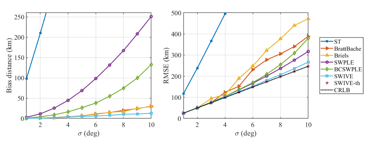 為解決SWPLE算法存在的偏差問(wèn)題,研究人員進(jìn)一步提出了基于工具變量法的球面加權(quán)工具變量估計(jì)器 (spherical weighted instrumental variable estimator, SWIVE)。通過(guò)理論分析得到SWIVE算法具有漸近無(wú)偏性和漸近有效性,數(shù)值仿真證明了這一結(jié)論。該技術(shù)可為基于廣域監(jiān)測(cè)網(wǎng)的次聲源定位需求及任務(wù)提供更加穩(wěn)定快速的解決方案。