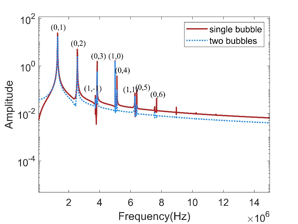 為解決這一問題,中國科學院聲學研究所超聲學實驗室博士生汪鈺與其導師陳德華研究員、吳鵬飛副研究員等人利用數值方法對多氣泡系統在雙頻超聲下的散射聲場進行計算,并研究氣泡相互作用對于氣泡散射聲場的影響。