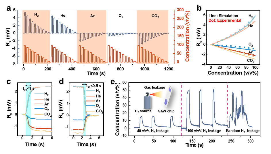聲表面波技術(shù)作為一種微納尺度的聲學(xué)MEMS器件技術(shù),是氣體傳感技術(shù)的重要分支。王文研究團(tuán)隊提出了一種基于聲阻抗效應(yīng)的聲表面波氣體泄漏新機(jī)制,用氣體負(fù)載產(chǎn)生的聲阻抗變化來調(diào)制聲表面波傳播,實現(xiàn)了對氣體泄漏的實時快速監(jiān)測,且具備微尺度、低功耗等特點。試驗結(jié)果顯示,基于聲阻抗效應(yīng)的泄漏傳感器成功實現(xiàn)了氫氣、氦氣、氬氣、氧氣、二氧化碳等氣體的快速(T90<1s,T10<0.5s)與寬量程(0-100%vol)泄漏檢測,同時該技術(shù)可實時動態(tài)地獲取呼吸速率、深度以及呼吸狀態(tài)等關(guān)鍵生理參數(shù),在人體健康監(jiān)測領(lǐng)域也具有良好的應(yīng)用前景。