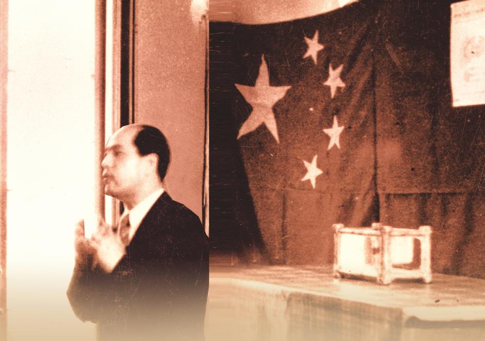 汪德昭保存著一張珍貴的照片,照片中的汪德昭身穿黑色西裝莊重地站在國旗前號召大家支援中國人民志愿軍,他的雙手貼在胸口,慷慨激昂地盈淚演講。