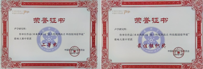為謳歌新中國成立75周年和中國科學(xué)院建院75周年以來的光輝歷程,講好中國科學(xué)院故事,激勵和鼓舞全院廣大職工努力搶占科技制高點(diǎn),中國科學(xué)院工會在全院范圍開展了“搶占科技制高點(diǎn) 科技報國迎華誕”主題歌詠大賽和詩歌征文書法繪畫攝影大賽,聲學(xué)所參賽作品《未來我來》榮獲歌詠大賽二等獎。聲學(xué)所也分別獲得這兩個大賽的優(yōu)秀組織獎。